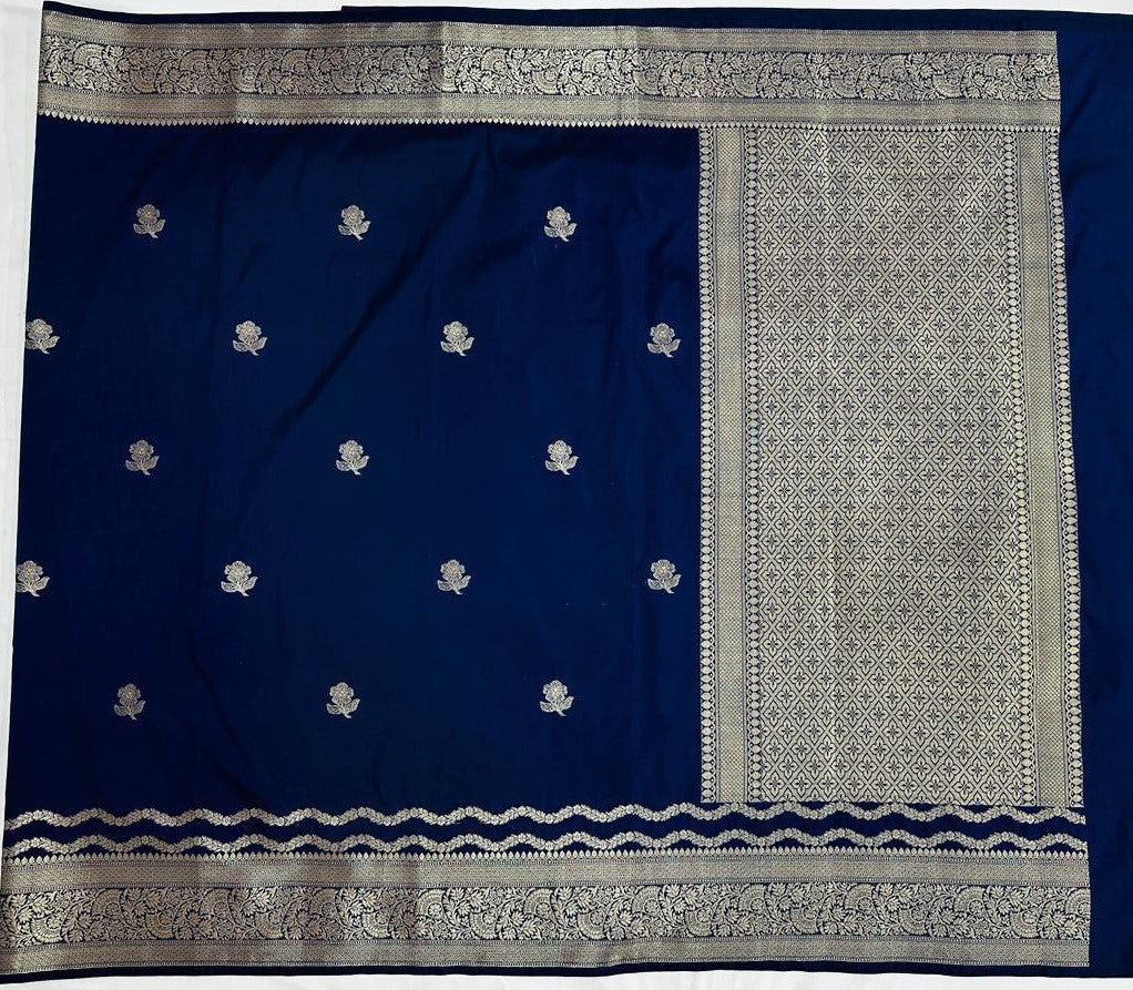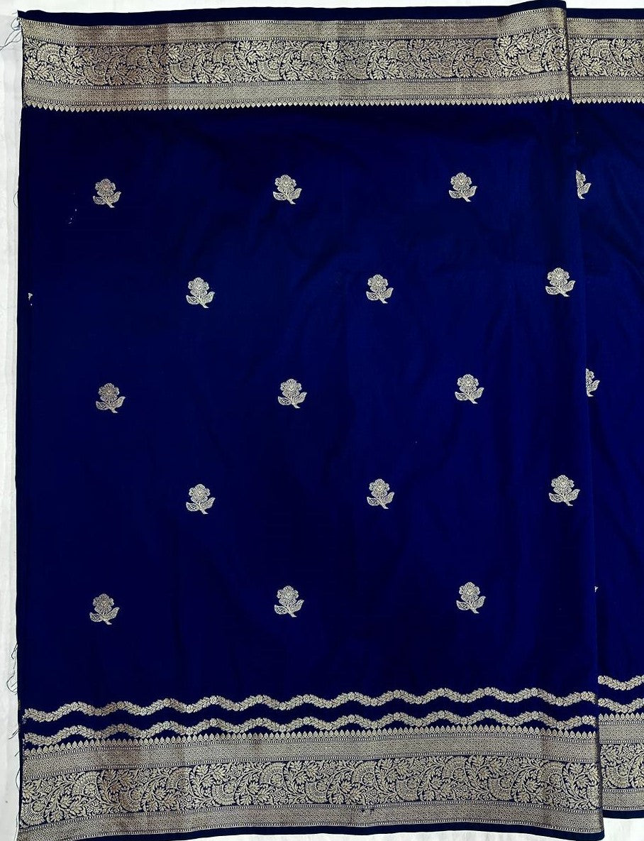 Why This Saree is Special: Blue sarees are eternally elegant and universally flattering. This Kadua Katan version elevates the classic blue saree with traditional Banarasi craftsmanship, creating a perfect fusion of timeless color and heritage weaving. The handloom silk ensures superior quality and drape.