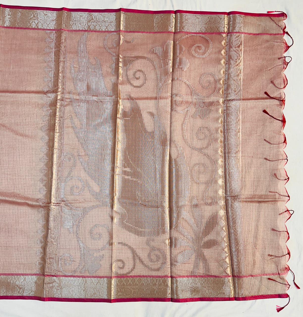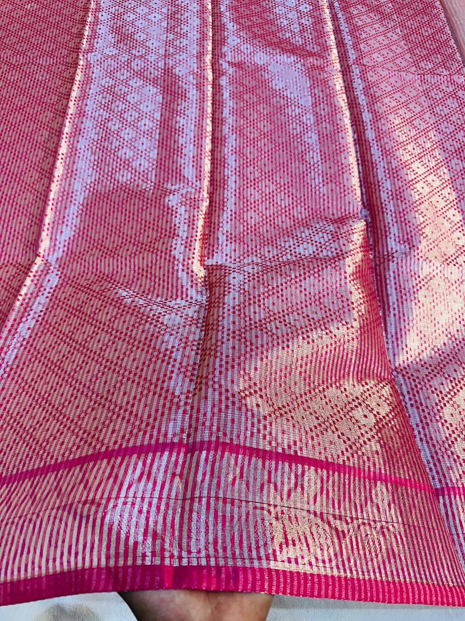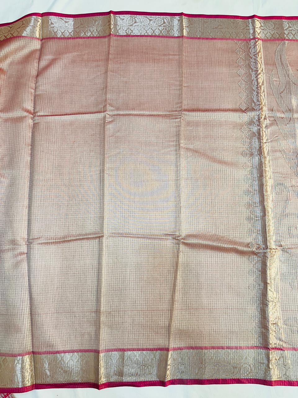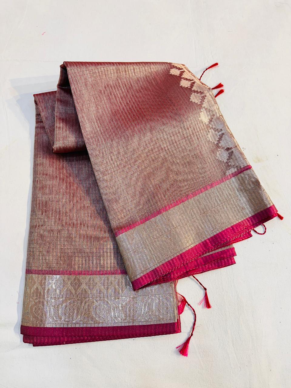 Embrace timeless elegance with our exquisite Tissue Stripe Silk Saree. This masterpiece showcases the revered art of traditional pallu weaving, where intricate patterns come to life against a lustrous silk canvas. Delicate tissue stripes add a subtle, shimmering dimension, making this saree perfect for festivals, weddings, and special occasions.