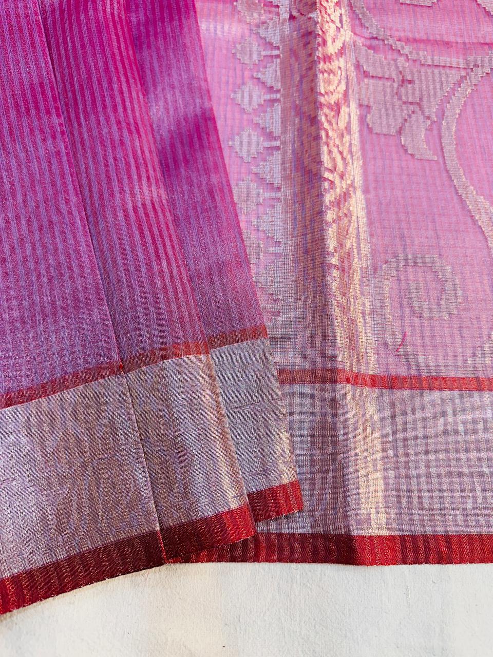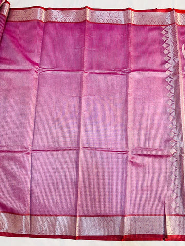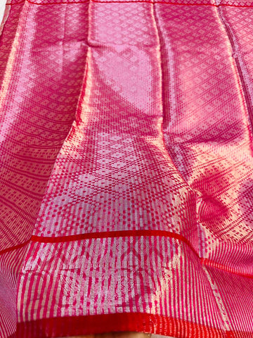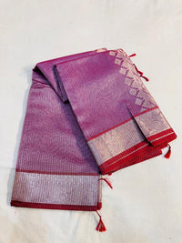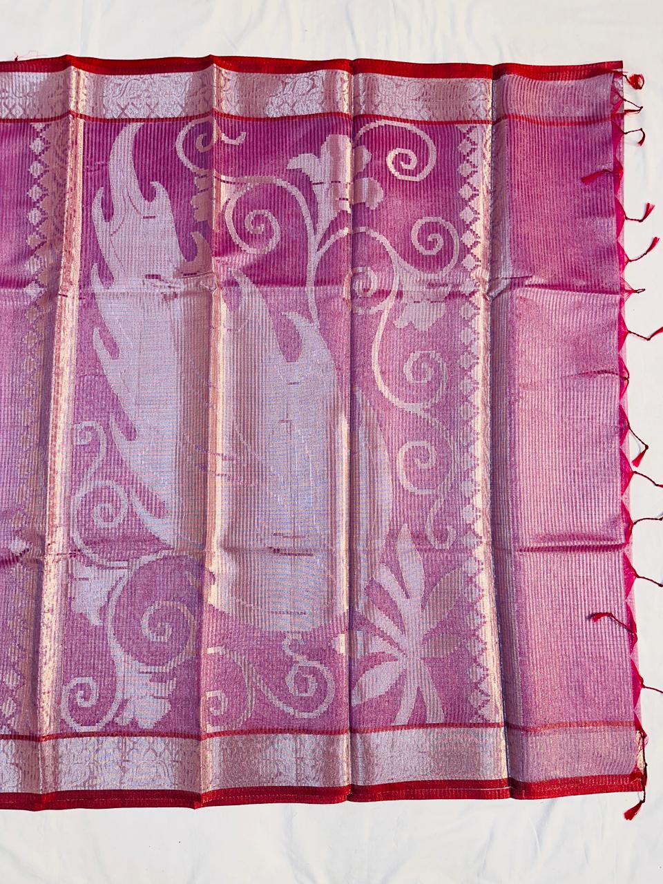 Embrace timeless elegance with our exquisite Tissue Stripe Silk Saree. This masterpiece showcases the revered art of traditional pallu weaving, where intricate patterns come to life against a lustrous silk canvas. Delicate tissue stripes add a subtle, shimmering dimension, making this saree perfect for festivals, weddings, and special occasions.