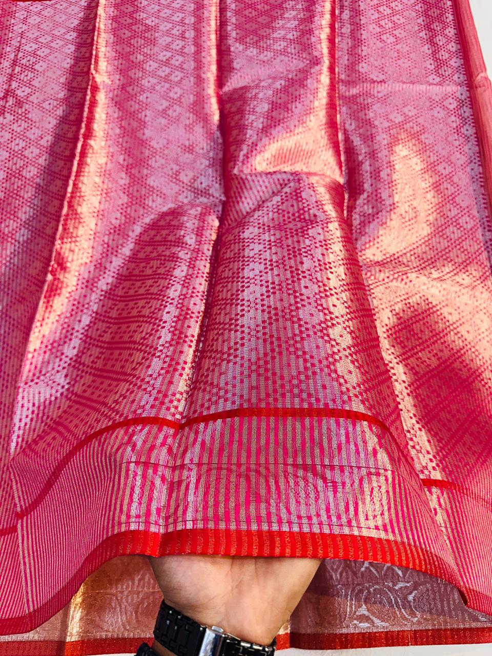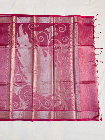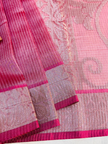 Embrace timeless elegance with our exquisite Tissue Stripe Silk Saree. This masterpiece showcases the revered art of traditional pallu weaving, where intricate patterns come to life against a lustrous silk canvas. Delicate tissue stripes add a subtle, shimmering dimension, making this saree perfect for festivals, weddings, and special occasions.